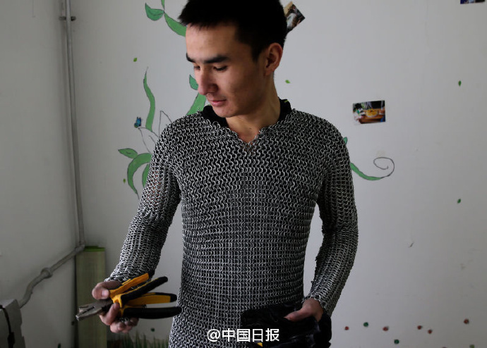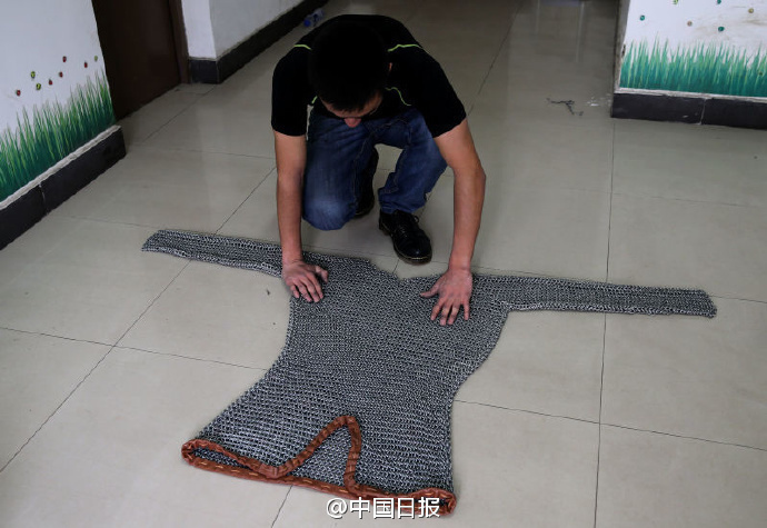 西安电子科技大学的哈斯木花一个月的时间用12000个小铁圈手工制出一件重约20公斤的“锁子甲”。